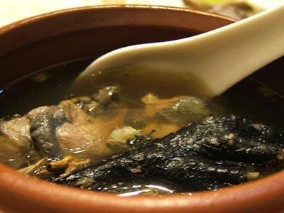 三七补肾食疗一是煨炖。先以干三开根二至三两,用清水浸泡半小时(新鲜三七根不再浸泡),洗净待用。两斤左右的乌骨鸡一只,宰杀不开膛,只在鸡的肛门处开一小口,掏出内脏洗净备用。然后将三七根填入鸡的空腹内,把鸡和少许姜片、胡椒、鸡内脏、盐巴装入沙锅,加盖以文火煨煮,一直煨至气味芳香扑鼻,即可食用。